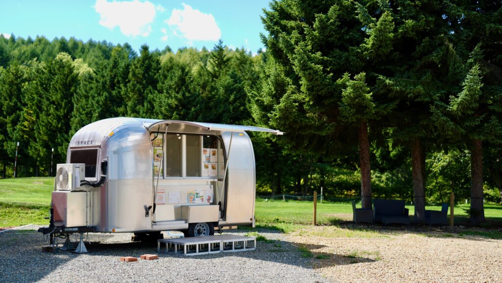 お隣のキッチンカー『ボヌール』では、米粉を使ったモチモチ食感のワッフルやクレープ、爽やかなドリンクをご用意しています。焼き立てをそのままお召し上がりいただくこともできます。(ボヌールは冬季休業いたします)